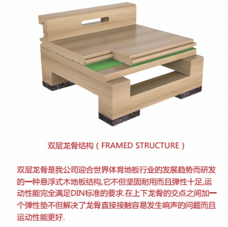 双层龙骨结构通常由表板+毛地板+龙骨+弹性胶垫+龙骨+弹性胶垫组成,是一种专业性较强的结构系统。在上下龙骨的交点之间加一个弹性减震垫,可以增强系统结构的稳定性,避免龙骨直接接触容易产生响声,提高运动性能。整体表现出坚固耐用、弹性足等优点。