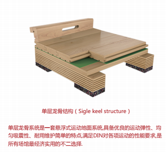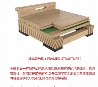 主辅龙骨从大的分类上来说属于单层龙骨结构。单层龙骨通常由表板+毛地板+龙骨+弹性胶垫组成,是目前国内使用比较广泛的一种木地板结构系统。具备良好的运动弹性、均匀的高吸震性、耐用、维护简单等特点,同时克服了实木地板因单体收缩而引起龙骨容易旋切变形的不足,具有非常好的稳定性,满足德国DIN对于体育馆木地板关于弹性、垂直变形、滚动负载等技术要求。该结构适用于建造规模小,投资少,使用频率和密度相对稳定的中小学、社区、工企健身用综合性场馆等。