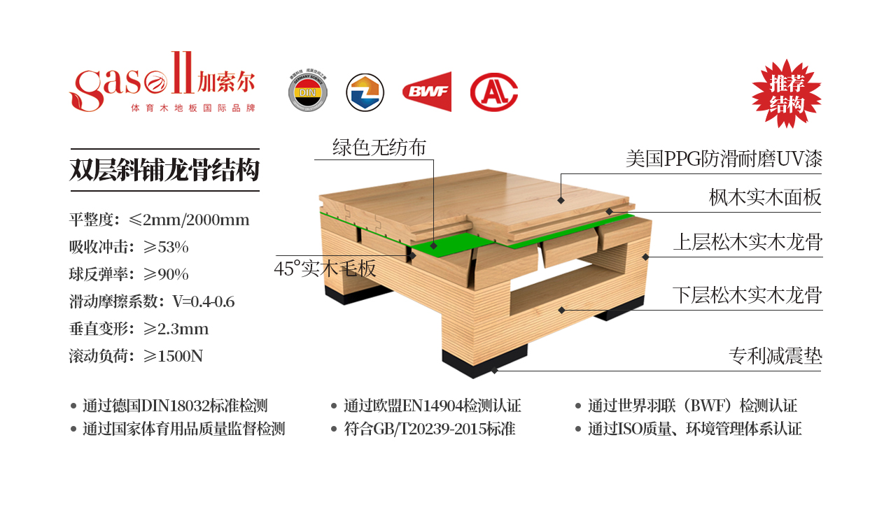 体育馆用的实木拼接地板及实木复合地板的表板,虽然只在表层使用珍贵阔叶材,但表板的种类、厚度、涂饰工艺等影响地板使用寿命和性能,地板表板与基材的厚度比,也会影响其尺寸稳定性、高弹力及高保温性。